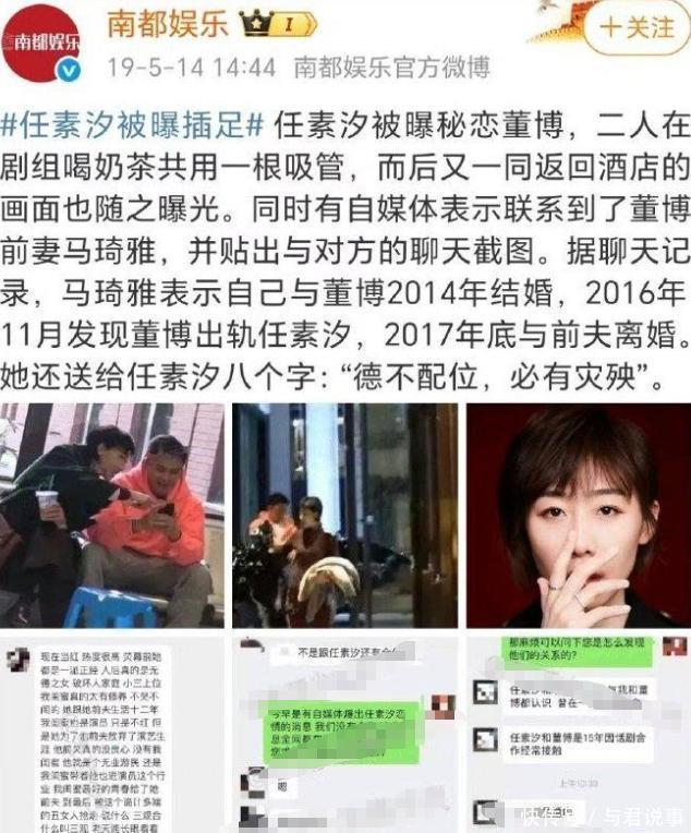 再后来有人拍到任和董两个人在剧组同喝一杯奶茶,一起回酒店,半夜牵手逛街等等,两个人的关系彻底曝光。 看到两人在一起,董的前妻出来指责任素汐插足自己的婚姻,并且还送给任几个字“德不配位,必有殃灾”。